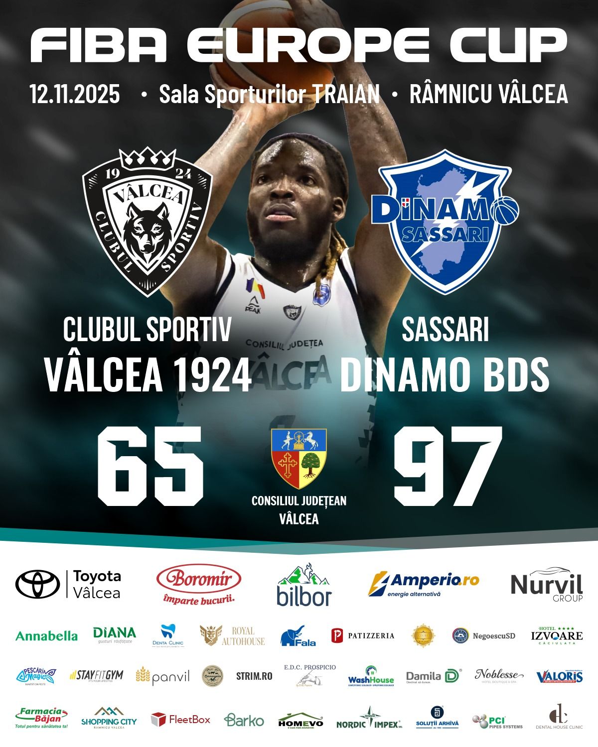 Echipa de baschet masculin CS Vâlcea 1924 a înfruntat miercuri seara, în Sala Sporturilor „Traian”, redutabila formație italiană Dinamo BDS Sassari, într-un duel din etapa a 5-a a FIBA Europe Cup. Chiar dacă diferența de valoare și experiență s-a văzut de la primele minute, atmosfera a fost una incendiară, iar publicul vâlcean a creat din nou un spectacol aparte.
