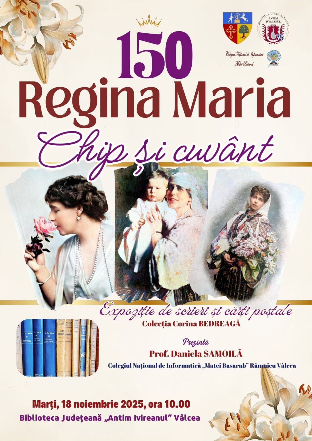 Biblioteca Județeană „Antim Ivireanul” Vâlcea deschide marți, 18 noiembrie 2025, de la ora 10.00, porțile unui eveniment cultural dedicat uneia dintre cele mai puternice și luminoase figuri ale României moderne: Regina Maria.