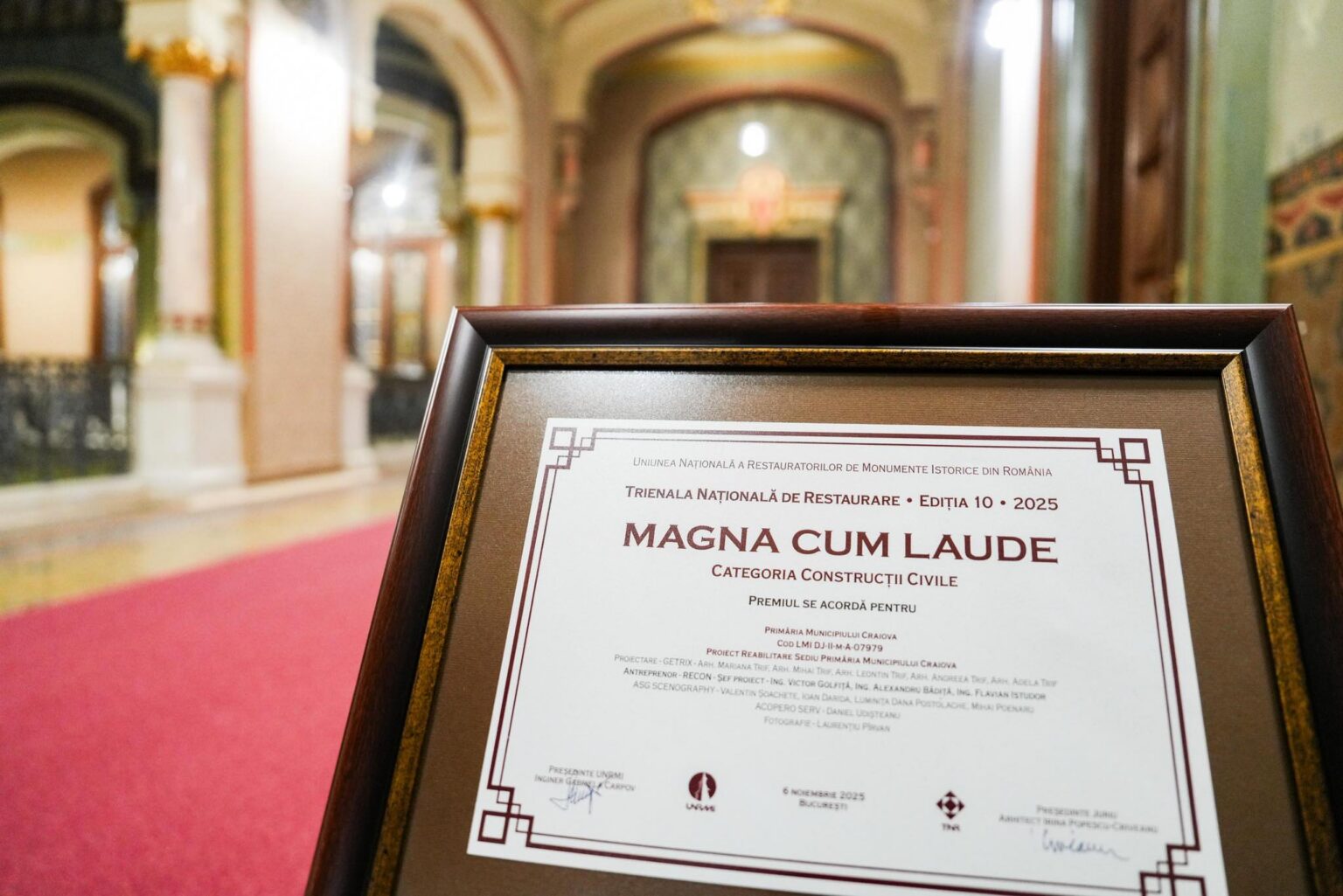 „Monument istoric, sediul Primăriei Craiova este o clădire emblematică pentru toată regiunea Olteniei. În momentul în care a fost proiectată de arhitectul Ion Mincu în 1906 și finalizată în 1916 de către elevul acestuia, Constantin Iotzu, clădirea a fost realizată și prevăzută cu cele mai bune materiale care se găseau la acea vreme: mozaic venețian, stucatură, lanternouri, vitralii și învelitoare din zinc. Tâmplăria, lamperia și mobilierul au fost executate la Viena, iar pereții cu lambriuri aurite și policrome, stucaturi, vopsitorii artistice în ulei, pardoseala cu marmură și mozaicuri, vitraliile sau grilajele din fier au fost executate, ca și mobilierul, în străinătate. Toate aceste elemente au fost readuse la viață în urma reabilitării întregii clădiri, iar rezultatul a fost unul spctaculos, confirmat prin obținerea celor două premii,” a declarat primarul Craiovei, Lia Olguța Vasilescu.