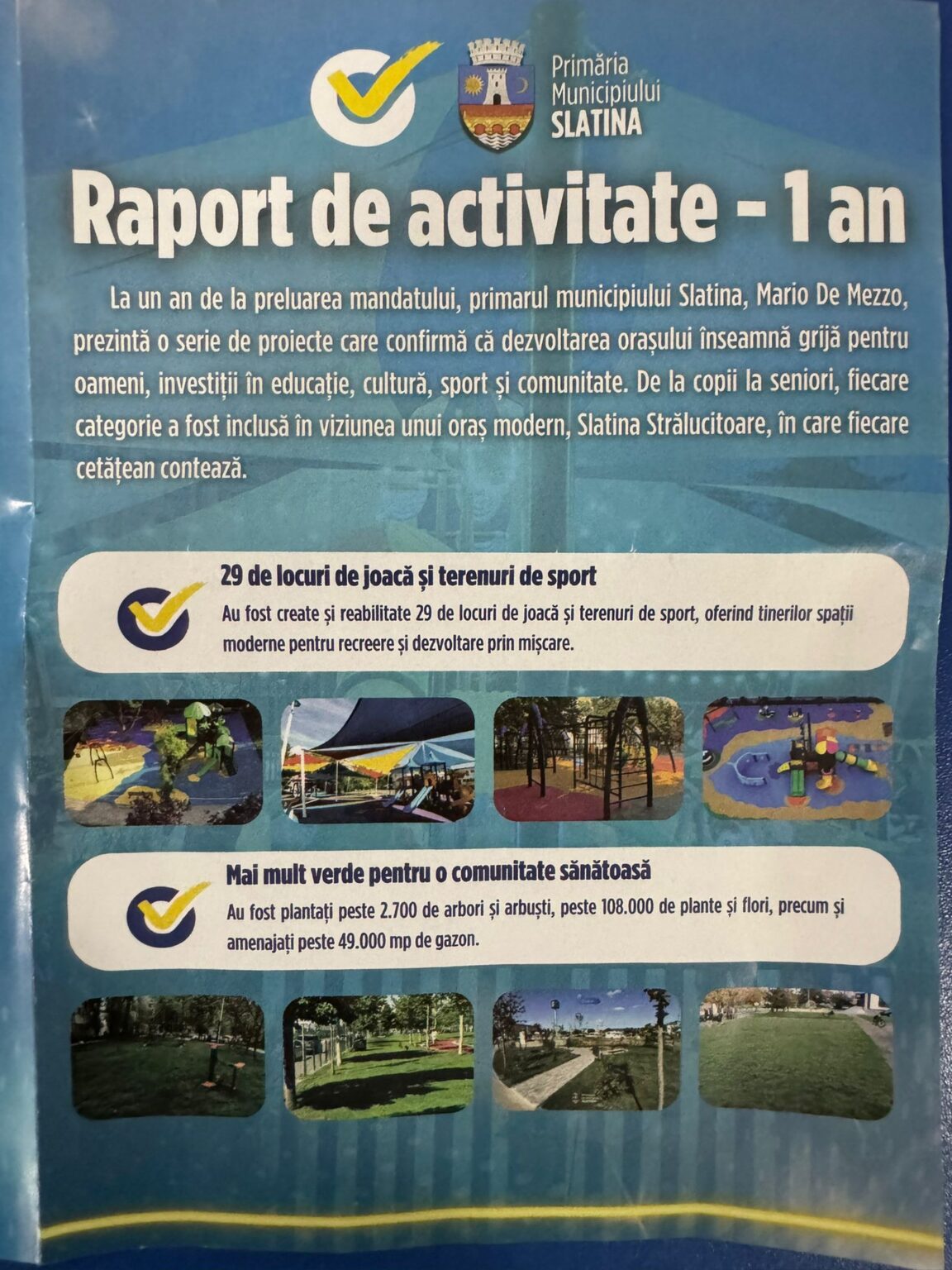 Primăria Slatina a comandat tipărirea unui număr impresionant de 37.000 de pliante menite să sintetizeze raportul de activitate al primarului Mario De Mezzo pentru primul an de mandat. Materialele informative au ajuns deja în scările de bloc din oraș. Firma care le-a tipărit are un singur angajat şi a primit contractul prin atribuire directă.