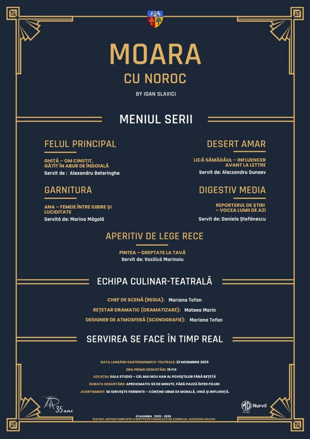 Nuvela „Moara cu noroc” a fost scrisă de Ioan Slavici și a apărut în anul 1881, în volumul „Novele din popor”. Este considerată una dintre cele mai importante nuvele ale autorului, alături de „Pădureanca” și romanul „Mara”.Într-un han unde se învârt destine și tăcerile vorbesc mai mult decât cuvintele, se gătesc conflicte, se servește frică, se rumenesc alegeri greșite și se condimentează cu influență, putere și aparențe înșelătoare. Un spectacol servit fierbinte — cu gust amar, morală și influență. În viziunea celor două care au construit spectacolul, a regizoarei Mariana Tofan și a Mateei Marin, care semnează dramatizarea, „Moara cu noroc”, după Ioan Slavici, devine o experiență teatrală cu aromă contemporană — un mănunchi de povești despre putere, frică și aparențe, gătite lent în bucătăria unui han unde nimic nu rămâne nespus. În acest meniu al destinelor, fiecare personaj e un fel principal: un hangiu care vrea liniște, o femeie prinsă între iubire și luciditate, un jandarm care cântărește legea cu precizia unui cuțit bine ascuțit și un Lică Sămădăul care știe cum să condimenteze influența — rece, calculat, irezistibil. Proiecții live, știri în direct și un univers în care cuvintele devin ingrediente, iar alegerile — consecințe. O reinterpretare intensă și actuală a textului lui Slavici, în care totul se gătește pe foc interior.