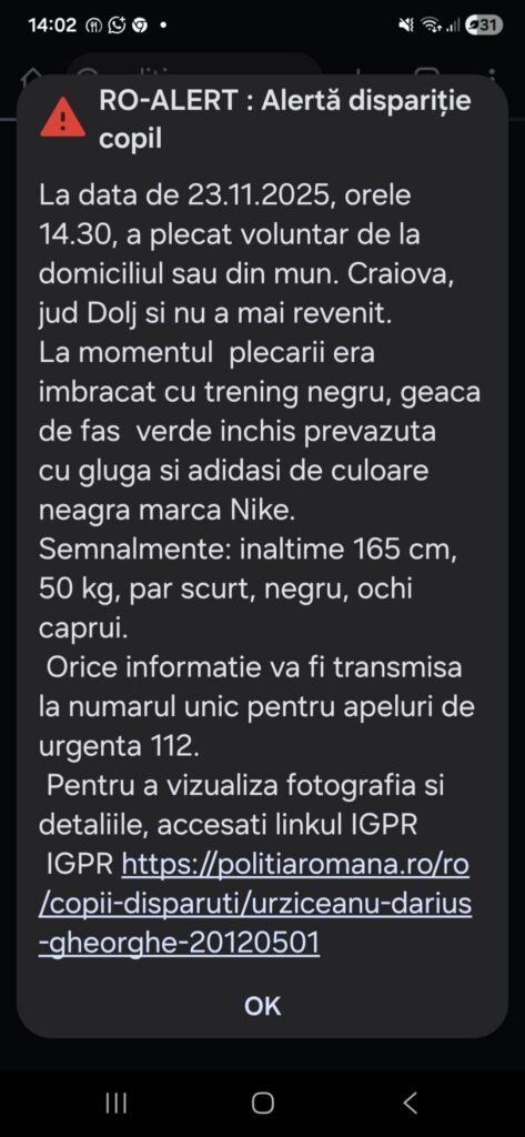 ”Polițiștii Secției 1 Poliție Craiova au fost sesizaţi de o femeie, din municipiul Craiova, cu privire la faptul că în cursul zilei de 23 noiembrie a.c., în jurul orei 11.00, fiul său, URZICEANU DARIUS GHEORGHE, de 13 ani, a plecat de la domiciliul comun și nu a mai revenit până în prezent„, anunță IPJ Dolj.
