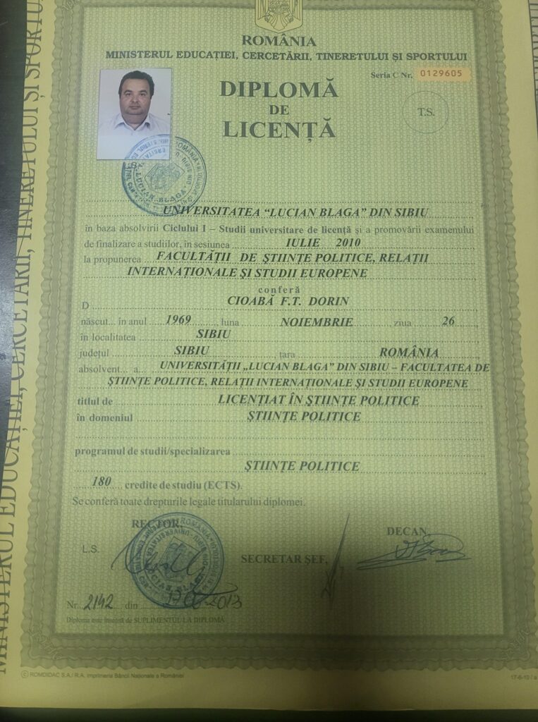 Cioabă și-a publicat pe Facebook diplomele obținute la Universitatea „Lucian Blaga” din Sibiu: o diplomă în Științe Politice, Relații Internaționale și Studii Europene, și alta în Drept.