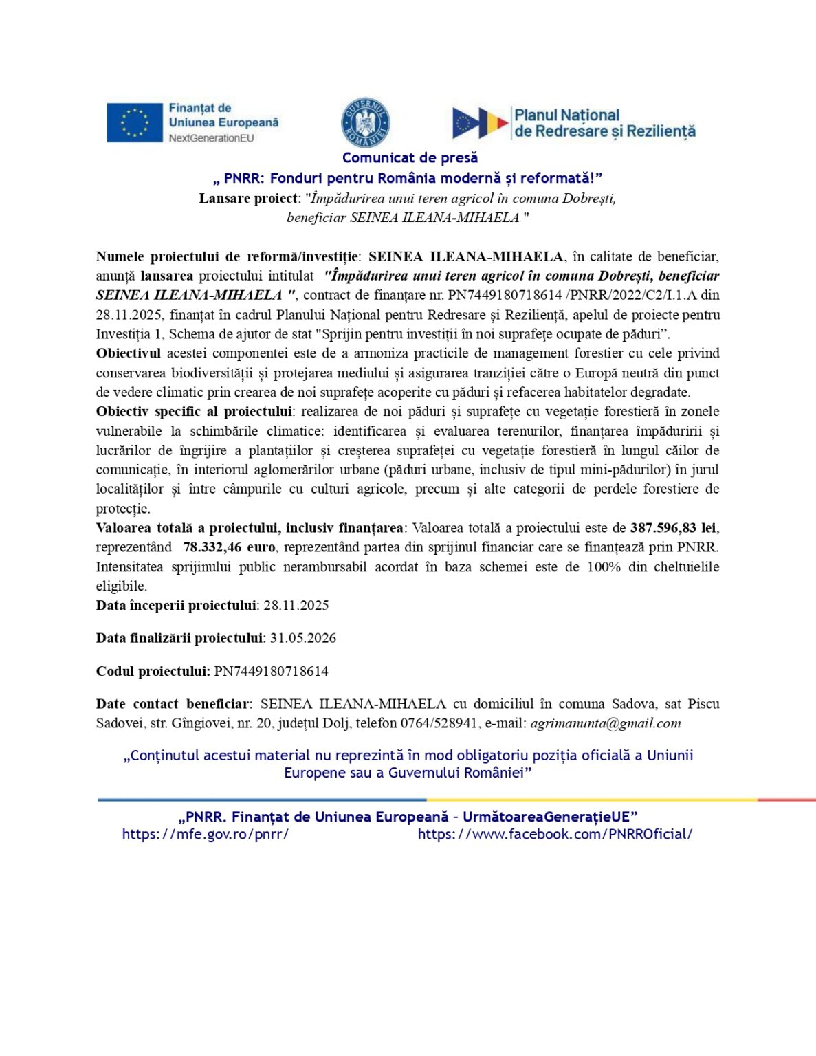 Numele proiectului de reformă/investiție: SEINEA ILEANA-MIHAELA, în calitate de beneficiar, anunță lansarea proiectului intitulat  „Împădurirea unui teren agricol în comuna Dobrești, beneficiar SEINEA ILEANA-MIHAELA”, contract de finanțare nr. PN7449180718614 /PNRR/2022/C2/I.1.A din 28.11.2025, finanțat în cadrul Planului Național pentru Redresare și Reziliență, apelul de proiecte pentru Investiția 1, Schema de ajutor de stat „Sprijin pentru investiții în noi suprafeţe ocupate de păduri”.