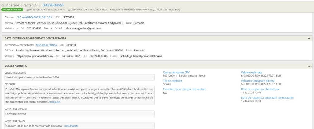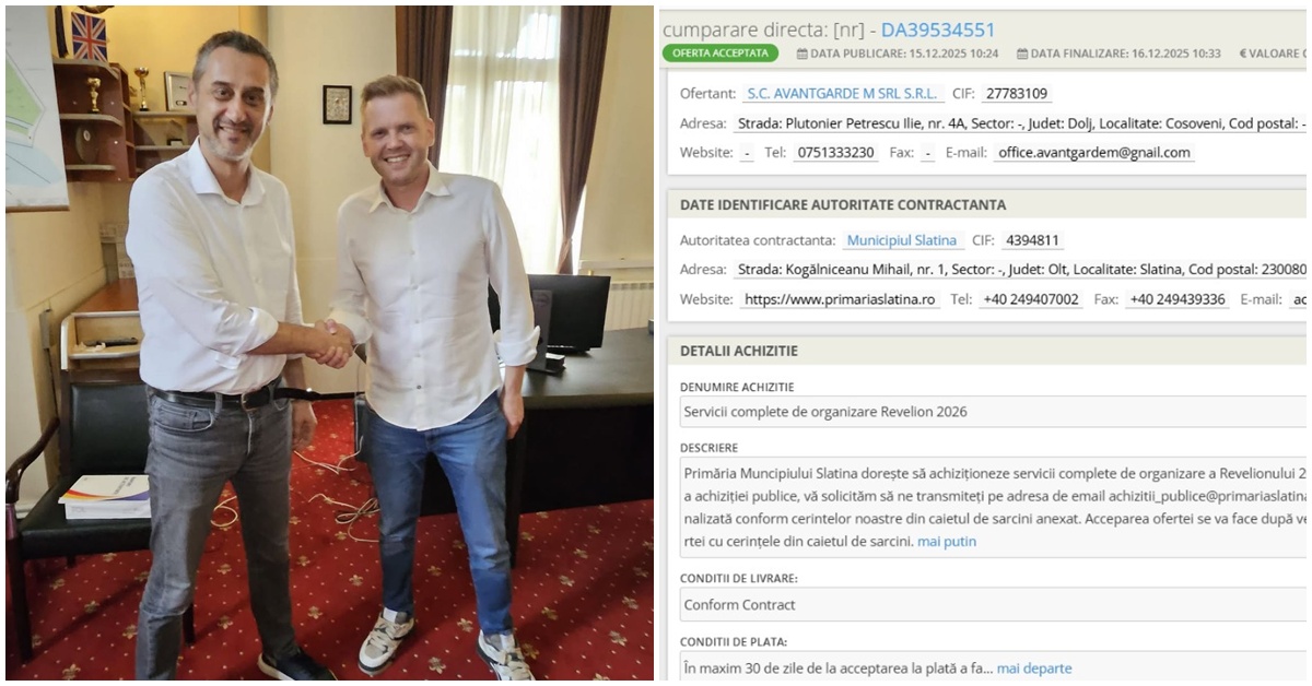 Slatina. Administrația locală pregătește o petrecere costisitoare pentru trecerea în noul an. Primăria Slatina, condusă de Mario De Mezzo, va plăti suma de 619.000 lei (aproximativ 122.175 euro) pentru organizarea evenimentului de Revelion. Contractul a stârnit controverse, fiind atribuit prin încredințare directă aceleiași firme care gestionează Târgul de Crăciun și care are legături strânse cu un apropiat politic al edilului.