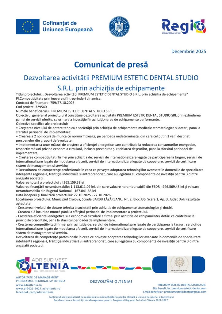 AnunturiComunicate de PresaDezvoltarea activitătii PREMIUM ESTETIC DENTAL STUDIO S.R.L. prin achiziţia de echipamente Jurnalul Olteniei 20 decembrie 2025 Share SHARE PREMIUM ESTETIC DENTAL STUDIO SRL achiziţie echipamente Jurnalul Olteniei See Full Bio Distribuie acest articol Facebook Whatsapp Whatsapp Email Copy Link Print Articolul precedent Mehedinți: Secția de Boli Infecțioase, modernizată complet Articolul următor Petrecere cu poliție și cătușe la CSM Slatina: Un angajat a ajuns la Psihiatrie după ce i-a agresat pe șefi Ultima ora Gripa ucide în Olt. Patru morți în acest sezon, iar numărul cazurilor explodează Alunecare de teren pe Dealul Stârmina: Trafic restricționat Mobilizare nocturnă pe ger în Craiova: Directorul DGAS și asistenții sociali, în căutarea oamenilor fără adăpost. Cine a acceptat ajutorul Trenuri blocate spre Craiova: Șină ruptă și întârzieri Medic din Târgu Jiu oferă screening gratuit de prostată FCSB vine tare din urmă. Gigi Becali e gata să pună presiune pe Universitatea Craiova Semnal de alarmă pentru Universitatea Craiova: „Până la meciul următor, ai luat bătaie” Record pe Aeroportul Craiova: Zboruri noi și trafic record Clasa pregătitoare 2026: cum alegi școala potrivită Caracal: Coșmarul apei. Doldurea: „Mi-e foarte teamă!”