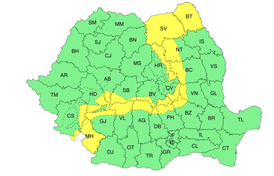 Din cursul nopții intră în vigoare o altă avertizare COD GALBEN, valabilă până luni dimineață, la ora 10.00.