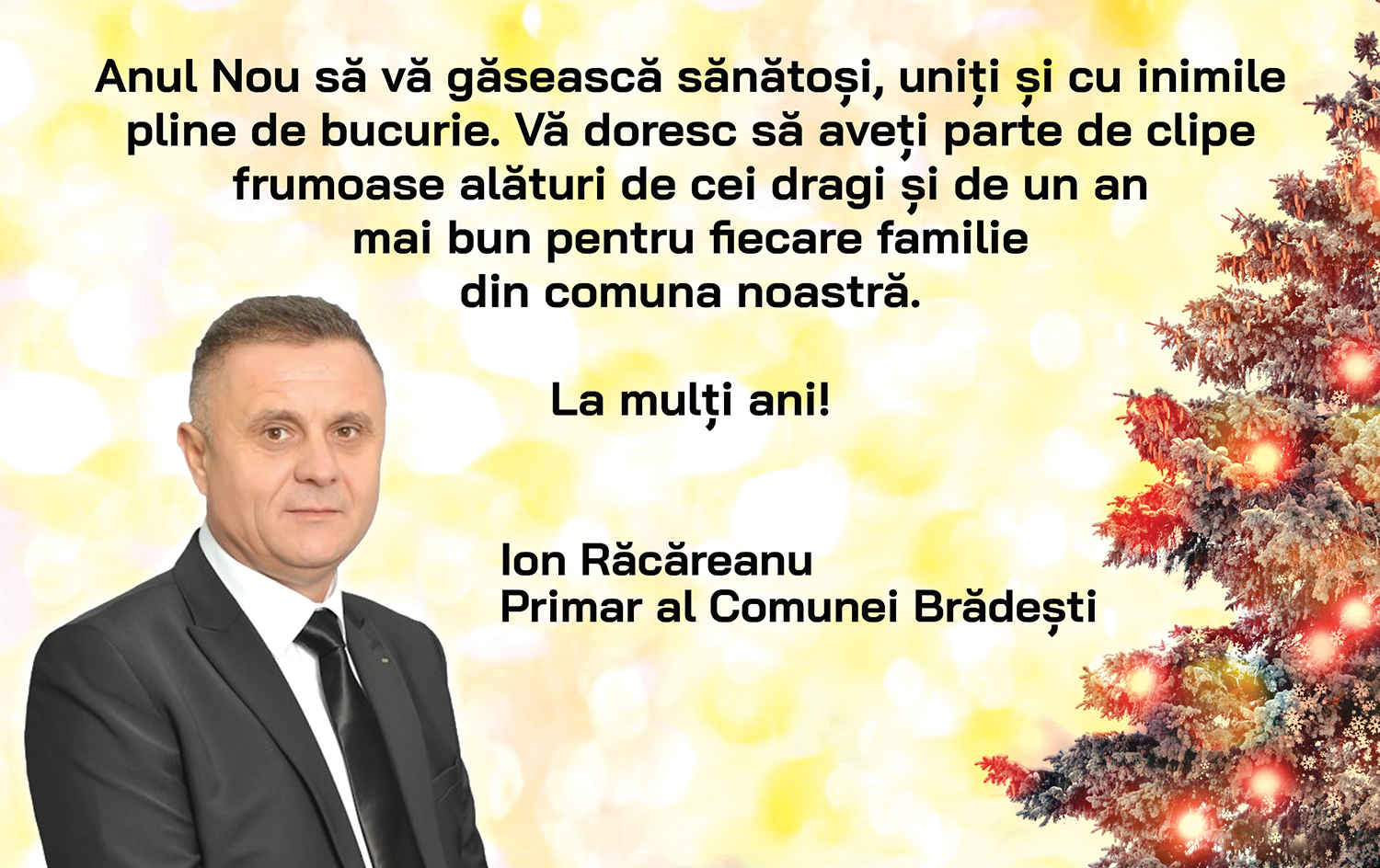 DoljOlteniaUrarea de an nou a primarului comunei Brădești Jurnalul Olteniei 30 decembrie 2025 Share Urarea de an nou a primarului comunei Brădești SHARE Jurnalul Olteniei See Full Bio Distribuie acest articol Facebook Whatsapp Whatsapp Email Copy Link Print Articolul precedent Scandal de Crăciun la Morunglav: Patru bărbați au ajuns în arest după o bătaie pe terasa unui bar. Poliția a intervenit Articolul următor Mehedinți. A incendiat o anexă. O femeie, reținută Ultima ora Premieră națională în medicină la Craiova: Primul defibrilator extravascular cu monitorizare la distanță, implantat la Spitalul Județean Metallica și Iron Maiden, la București în 2026 Controale la sânge în Dolj. Amenzi de 1,6 milioane de lei și sute de kilograme de alimente confiscate de inspectorii DSVSA Investiție de 14,7 milioane de lei la Spitalul Caracal. Ambulatoriul, dotat cu aparatură de ultimă generație Comercializare ilegală de artificii: patru persoane anchetate în Gorj Anul Nou 2026: Cele mai frumoase obiceiuri și tradiții Râmnicu Vâlcea câștigă o sală de sport modernă pentru tineri Orșova: Zeci de kilograme de articole pirotehnice confiscate Urarea de an nou a primarului comunei Leu Mehedinți. A incendiat o anexă. O femeie, reținută