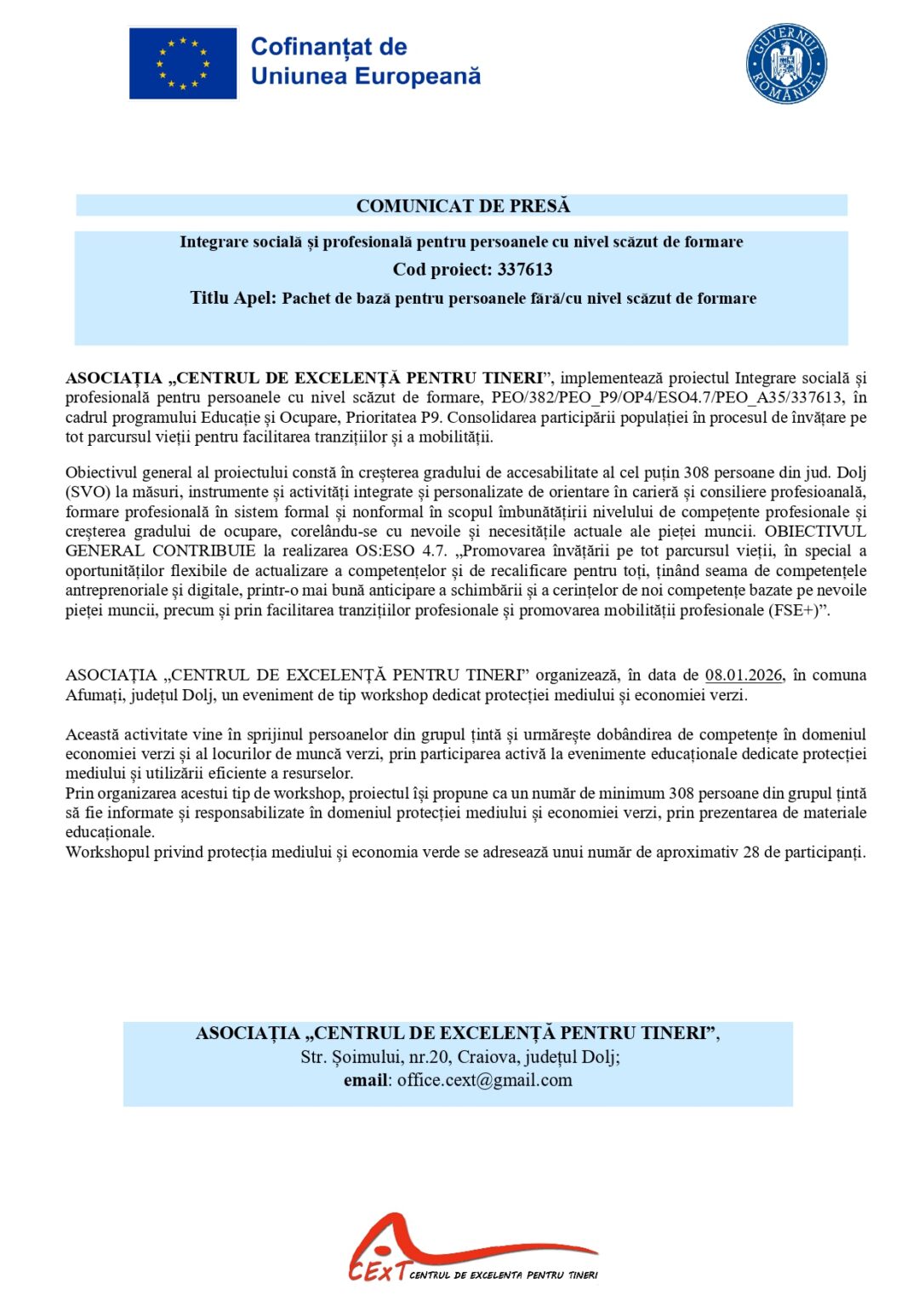 ASOCIAȚIA „CENTRUL DE EXCELENȚĂ PENTRU TINERI” organizează, în data de 08.01.2026, în comuna Afumați, județul Dolj, un eveniment de tip workshop dedicat protecției mediului și economiei verzi.
