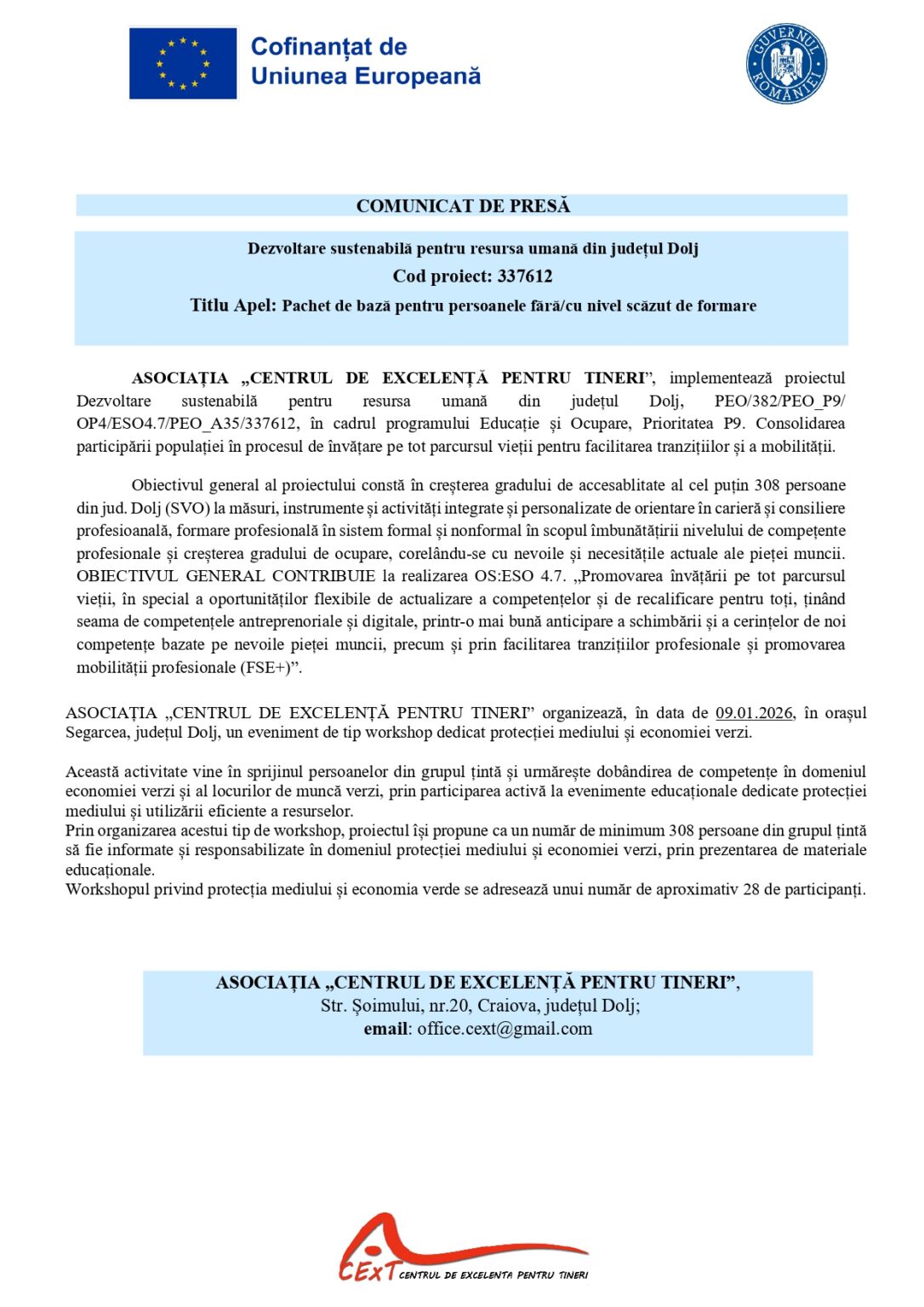 ASOCIAȚIA „CENTRUL DE EXCELENȚĂ PENTRU TINERI”, implementează proiectul Dezvoltare sustenabilă pentru resursa umană din județul Dolj, PEO/382/PEO_P9/ OP4/ESO4.7/PEO_A35/337612, în cadrul programului Educație și Ocupare, Prioritatea P9. Consolidarea participării populației în procesul de învățare pe tot parcursul vieții pentru facilitarea tranzițiilor și a mobilității.