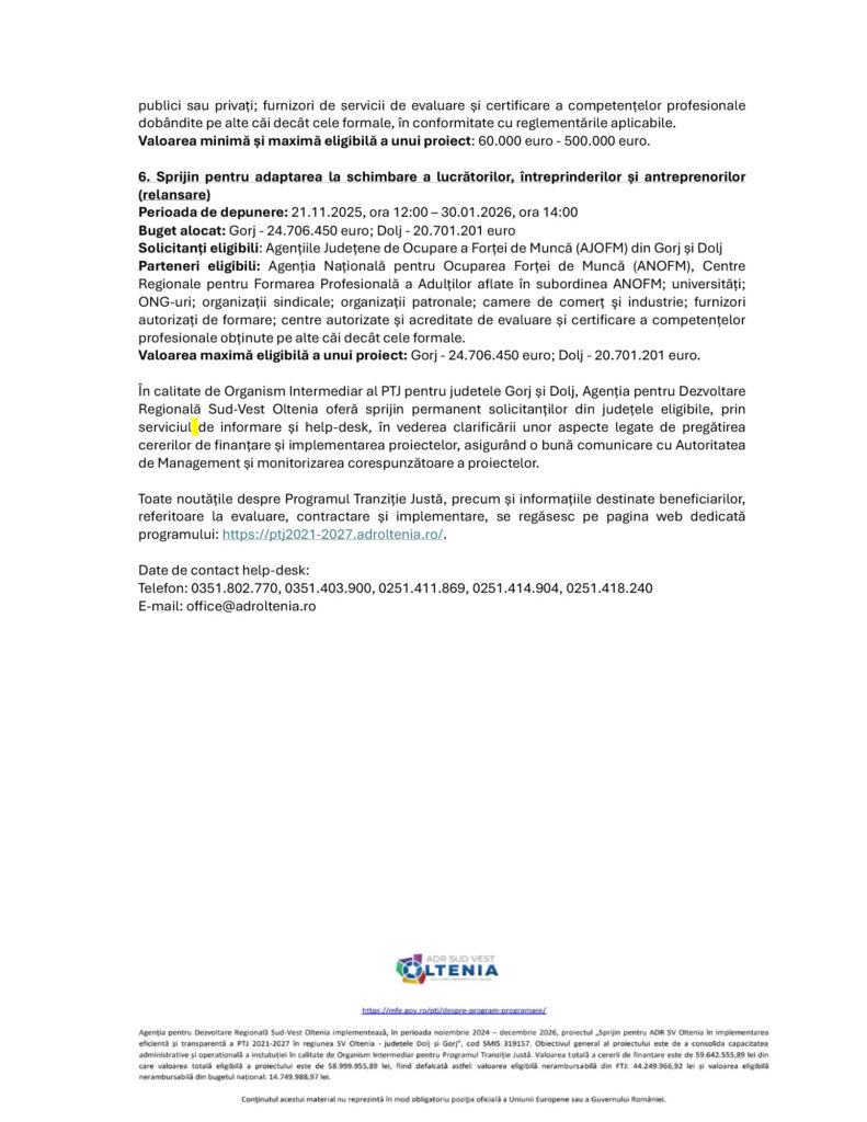 Toate noutățile despre Programul Tranziție Justă, precum și informațiile destinate beneficiarilor, referitoare la evaluare, contractare și implementare, se regăsesc pe pagina web dedicată programului: https://ptj2021-2027.adroltenia.ro/.