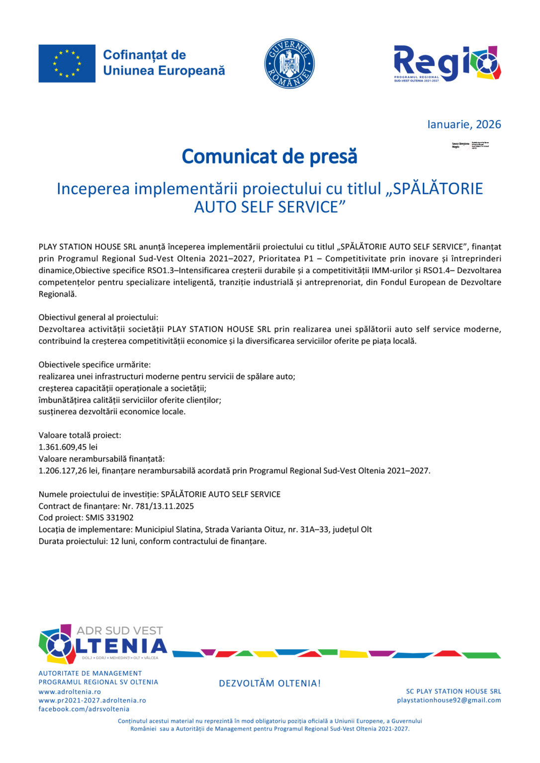 PLAY STATION HOUSE SRL anunță începerea implementării proiectului cu titlul „SPĂLĂTORIE AUTO SELF SERVICE”, finanțat prin Programul Regional Sud-Vest Oltenia 2021–2027, Prioritatea P1 – Competitivitate prin inovare și întreprinderi dinamice, Obiective specifice RSO1.3–Intensificarea creșterii durabile și a competitivității IMM-urilor și RSO1.4– Dezvoltarea competențelor pentru specializare inteligentă, tranziție industrială și antreprenoriat, din Fondul European de Dezvoltare Regională.