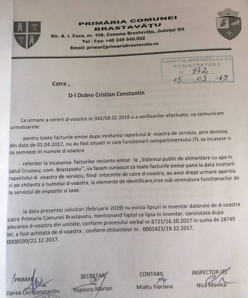 Cristian Dobre a funcționat ca gestionar la firma de apă din Brastavăţu, însă activitatea sa a lăsat în urmă o pagubă semnificativă. Potrivit documentelor obţinute de Gazeta Nouă, atunci când era gestionar la firma de apă din localitate, în perioada 2013-2017, Dobre a băgat mâna în vistieria firmei, provocând o pagubă de peste 28.000 lei.