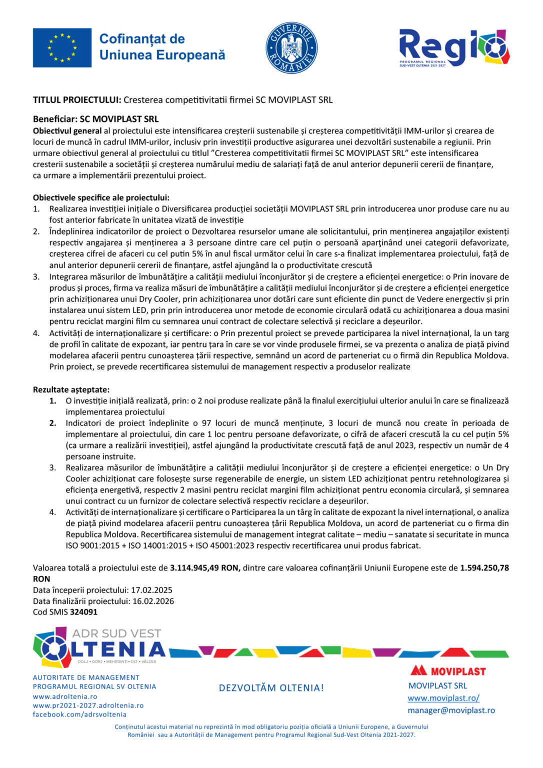 AnunturiComunicate de PresaCreșterea competitivității firmei SC MOVIPLAST SRL Jurnalul Olteniei 3 februarie 2026 Share Descrierea proiectului MOVIPLAST SRL SHARE Jurnalul Olteniei See Full Bio Distribuie acest articol Facebook Whatsapp Whatsapp Email Copy Link Print Articolul precedent Accident în Râmnicu Vâlcea provocat de un șofer de 80 ani Articolul următor Concursul de pictură inspirat de Brâncuși provoacă controverse majore Ultima ora Percheziții DIICOT la IȘJ Gorj: angajat cercetat într-un dosar penal Severin: Anchetă de amploare a Poliției într-un dosar penal Concursul de pictură inspirat de Brâncuși provoacă controverse majore Creșterea competitivității firmei SC MOVIPLAST SRL Accident în Râmnicu Vâlcea provocat de un șofer de 80 ani Gripa ucide în Olt. Patru morți în acest sezon, iar numărul cazurilor explodează Alunecare de teren pe Dealul Stârmina: Trafic restricționat Mobilizare nocturnă pe ger în Craiova: Directorul DGAS și asistenții sociali, în căutarea oamenilor fără adăpost. Cine a acceptat ajutorul Trenuri blocate spre Craiova: Șină ruptă și întârzieri Medic din Târgu Jiu oferă screening gratuit de prostată