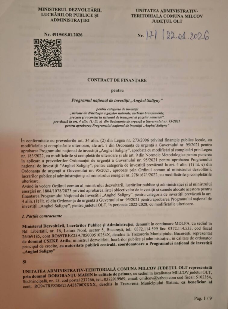 „Am onoarea să vă anunţ public că localitatea noastră marchează un pas important în modernizarea infrastructurii locale, odată cu semnarea contractului de finanțare pentru proiectul «Înființare sistem inteligent de distribuție gaze naturale în satele Ulmi, Milcovu din Deal, Milcovu din Vale și Stejaru», contract semnat în data de 22.01.2026 în urma căruia este subliniată importanța investiției pentru dezvoltarea durabilă a localității”, a declarat Marin Dorobanțu, primarul comunei Milcov.