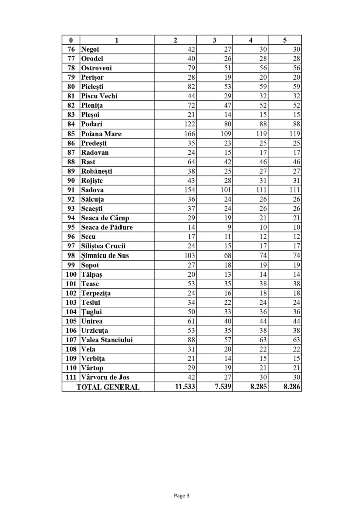 La polul opus, găsim localități care primesc sume mai mici: Gogoșu – 8 mii lei, Botoșești Paia – 11 mii lei, Brabova – 19 mii lei, Măceșu de Sus – 19 mii lei.