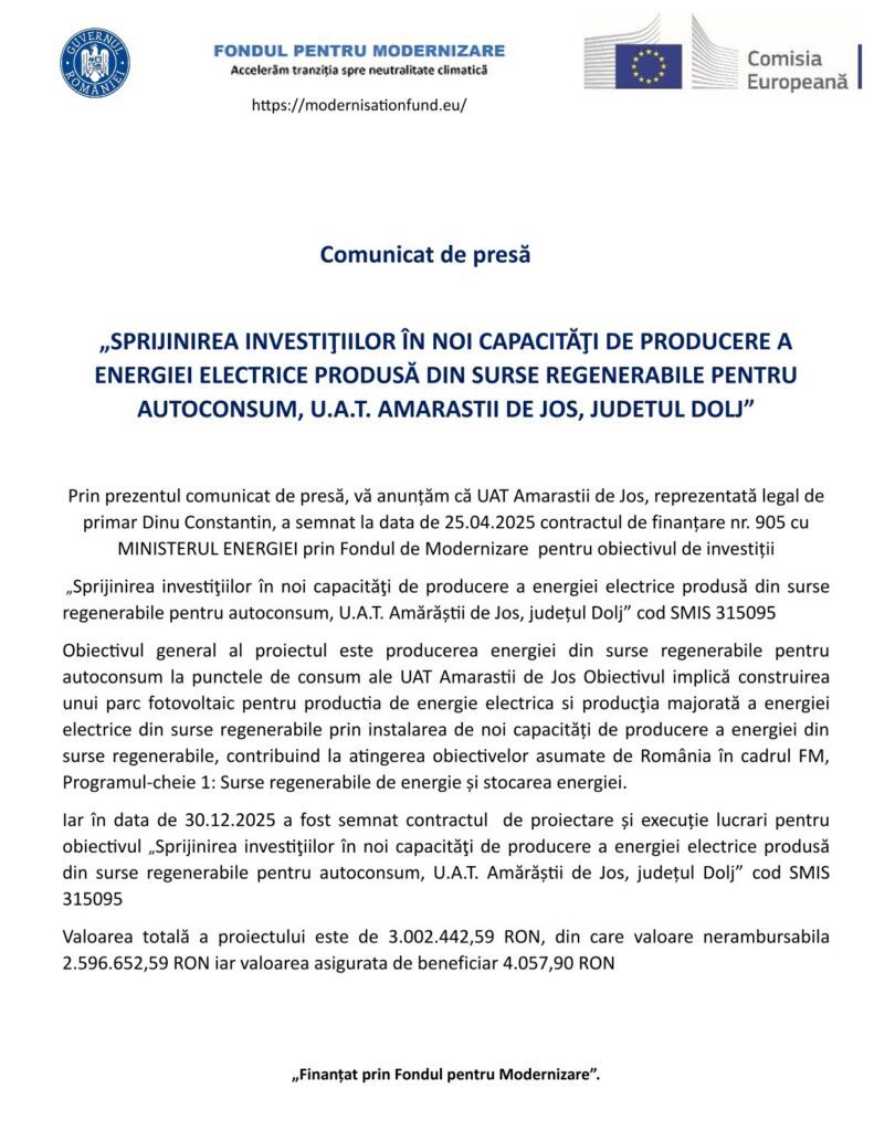 AnunturiComunicate de PresaSPRIJINIREA INVESTIŢIILOR ÎN NOI CAPACITĂŢI DE PRODUCERE A ENERGIEI ELECTRICE PRODUSĂ DIN SURSE REGENERABILE PENTRU AUTOCONSUM, U.A.T. AMARASTII DE JOS, JUDETUL DOLJ Jurnalul Olteniei 10 februarie 2026 Share SHARE Construire parc fotovoltaic Jurnalul Olteniei See Full Bio Distribuie acest articol Facebook Whatsapp Whatsapp Email Copy Link Print Articolul precedent Grav accident în Mușetești,Gorj: Bărbat prins sub tractor Articolul următor Copil de 4 ani, adus la UPU Târgu Jiu în comă. Anchetă Ultima ora Olt: Sute de cazuri de gripă, măsuri drastice Eurotehnica revoluționează stocarea energiei în România: Lansarea sistemelor Atmoce Retrofit Copil de 4 ani, adus la UPU Târgu Jiu în comă. Anchetă SPRIJINIREA INVESTIŢIILOR ÎN NOI CAPACITĂŢI DE PRODUCERE A ENERGIEI ELECTRICE PRODUSĂ DIN SURSE REGENERABILE PENTRU AUTOCONSUM, U.A.T. AMARASTII DE JOS, JUDETUL DOLJ Grav accident în Mușetești,Gorj: Bărbat prins sub tractor Grevă în primării! Bolojan: Reforme sau comasare Dosar penal în Craiova: Cal lovit la antrenament Percheziții în Gorj într-un dosar de evaziune fiscală CJ Dolj finanțează excelența sportivă cu 100.000 lei Slatina: Emil Albotă a lansat campania ironică „Adoptă o groapă”