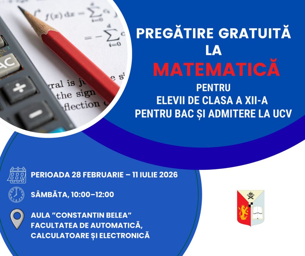 Facultatea de Automatică din Craiova oferă meditații la Matematică pentru Bac și Admitere 2026. Ședințele au loc în fiecare sâmbătă, între orele 10:00 și 12:00, începând cu 28 februarie.