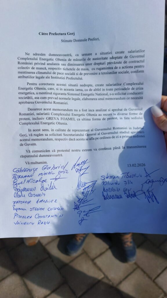 Ne adresăm dumneavoastră, ca urmare a situației create salariaților Complexului Energetic Oltenia de măsurile de austeritate adoptate de Guvernul României privind anularea sau diminuarea unor drepturi prevăzute de contractul colectiv de muncă, respectiv tichetele de masă, cu rugămintea de a acționa pentru menținerea climatului de pace socială și de prevenire a tensiunilor sociale, conform atribuțiilor legale ale Instituției Prefectului.
