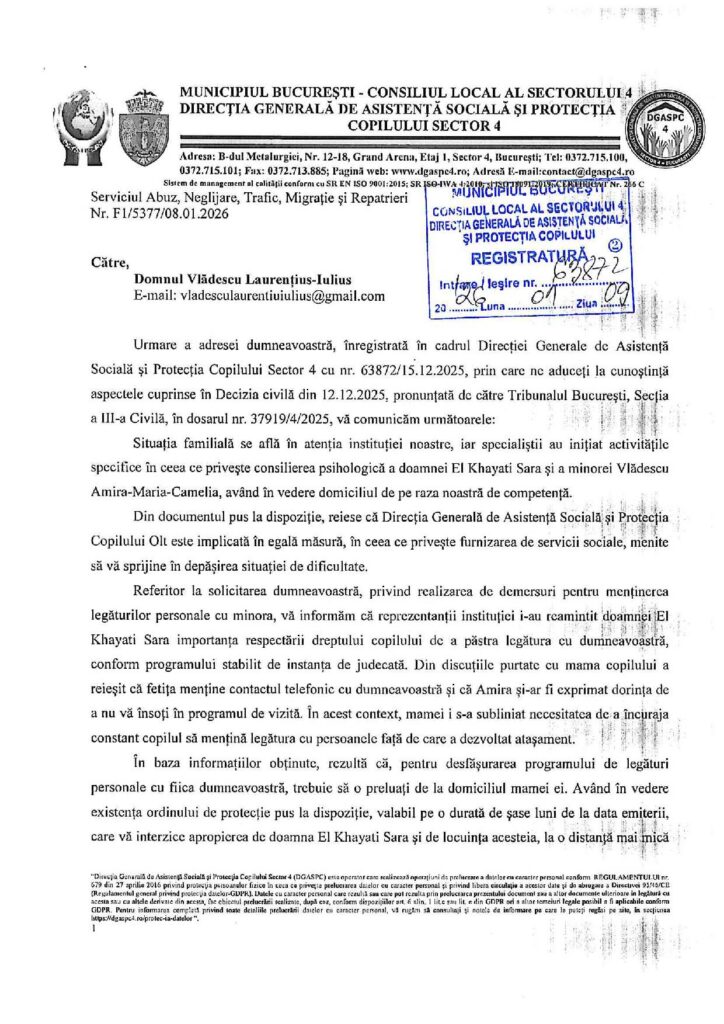 „Situația familială se află în atenția instituției noastre, iar specialiștii au inițiat activitățile specifice în ceea ce privește consilierea psihologică a doamnei El Khayati Sara și a minorei Vlădescu Amira-Maria-Camelia, având în vedere domiciliul de pe raza noastră de competență. Din discuțiile purtate cu mama copilului a reieșit că fetița menține contactul telefonic cu dumneavoastră și că Amira și-ar fi exprimat dorința de a nu vă însoți în programul de vizită. În acest context, mamei i s-a subliniat necesitatea de a încuraja constant copilul să mențină legătura cu persoanele față de care a dezvoltat atașament ”, a declarat conducerea instituției prin adresa oficială.