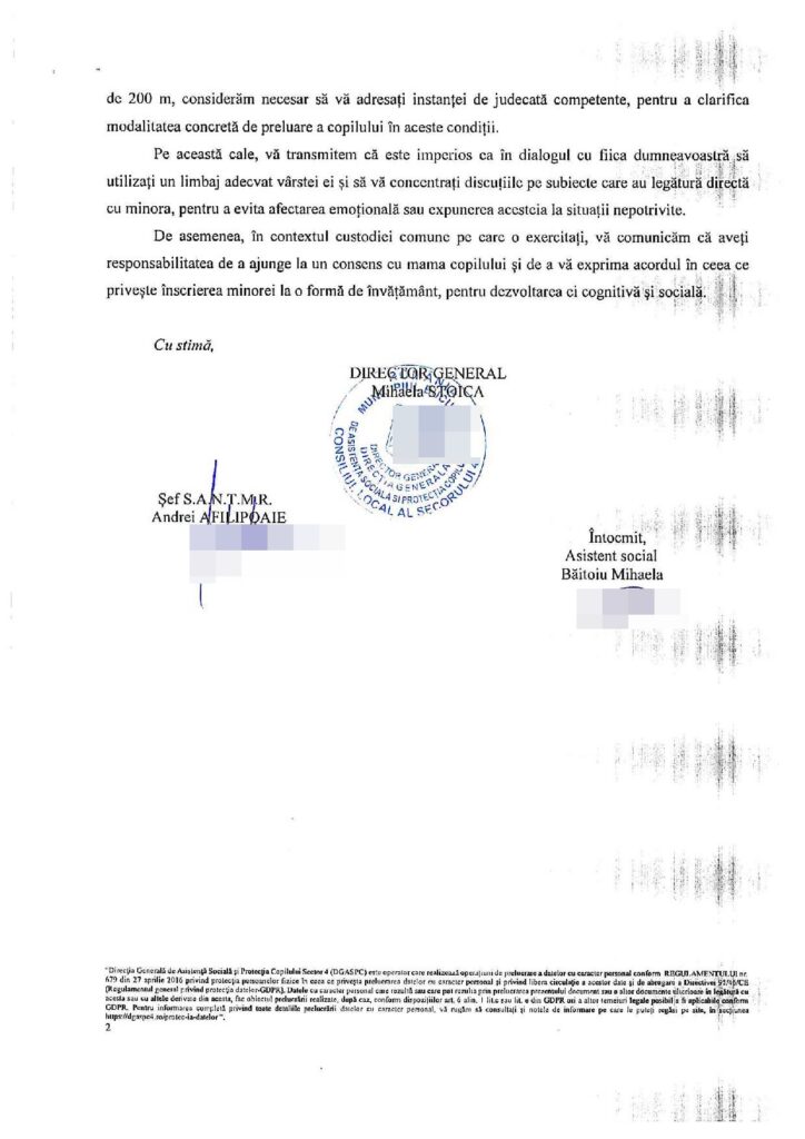 În urma sesizărilor depuse, Direcția Generală de Asistență Socială și Protecția Copilului Sector 4 București a transmis un punct de vedere oficial referitor la consilierea mamei și a minorei, dar și la obstacolele legale care îngreunează preluarea copilului de către tată.