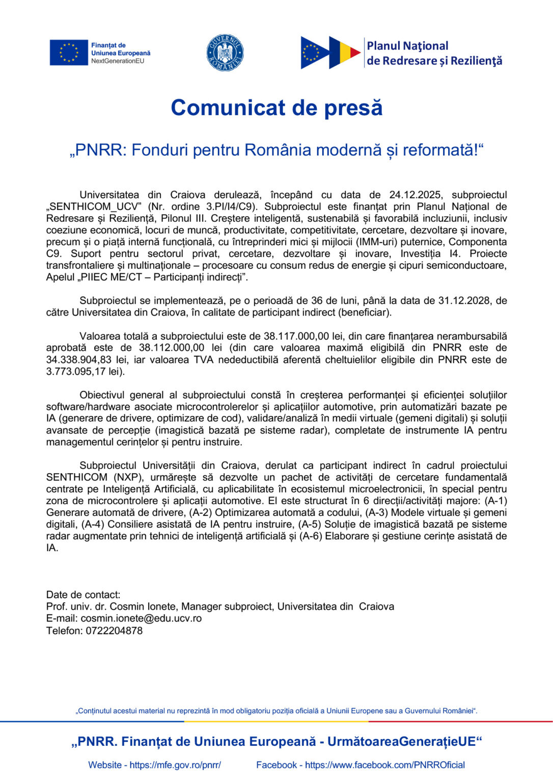 Universitatea din Craiova derulează, începând cu data de 24.12.2025, subproiectul „SENTHICOM_UCV” (Nr. ordine 3.PI/I4/C9). Subproiectul este finanțat prin Planul Național de Redresare și Reziliență, Pilonul III. Creștere inteligentă, sustenabilă și favorabilă incluziunii, inclusiv coeziune economică, locuri de muncă, productivitate, competitivitate, cercetare, dezvoltare și inovare, precum și o piață internă funcțională, cu întreprinderi mici și mijlocii (IMM-uri) puternice, Componenta C9. Suport pentru sectorul privat, cercetare, dezvoltare și inovare, Investiția I4. Proiecte transfrontaliere și multinaționale – procesoare cu consum redus de energie și cipuri semiconductoare, Apelul „PIIEC ME/CT – Participanți indirecți”.