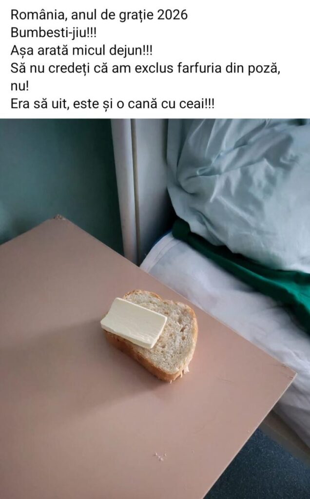 „Aşa arată „decontul”! În condițiile în care noi am fost trimiși să cumpărăm tratamentul, hârtia igienica și tot ce are nevoie un bolnav!!! 651,90 de Lei pe zi, atât costă un pat și o asistentă medicală, care vine doar când trebuie să îți facă tratamentul. România, anul de grație 2026. Bumbești-Jiu! Aşa arată micul dejun!!! Să nu credeți că am exclus farfuria din poză, nu! Era să uit, este și o cană cu ceai!”, a transmis acesta.