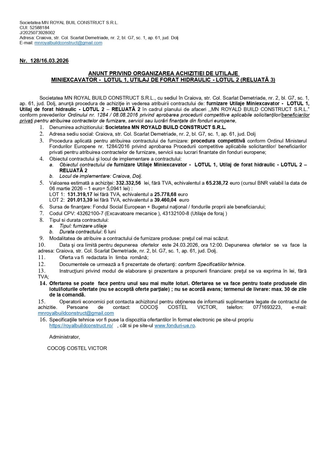Societatea MN ROYAL BUILD CONSTRUCT S.R.L., cu sediul în Craiova, str. Col. Scarlat Demetriade, nr. 2, bl. G7, sc. 1, ap. 61, jud. Dolj, anunţă procedura de achiziţie in vederea atribuirii contractului de: furnizare Utilaje Miniexcavator – LOTUL 1, Utilaj de forat hidraulic – LOTUL 2 – RELUATÃ 2 ȋn cadrul planului de afaceri ,,MN ROYALD BUILD CONSTRUCT S.R.L.” conform prevederilor Ordinului nr. 1284 / 08.08.2016 privind aprobarea procedurii competitive aplicabile solicitanţilor/beneficiarilor privaţi pentru atribuirea contractelor de furnizare, servicii sau lucrări finanţate din fonduri europene,