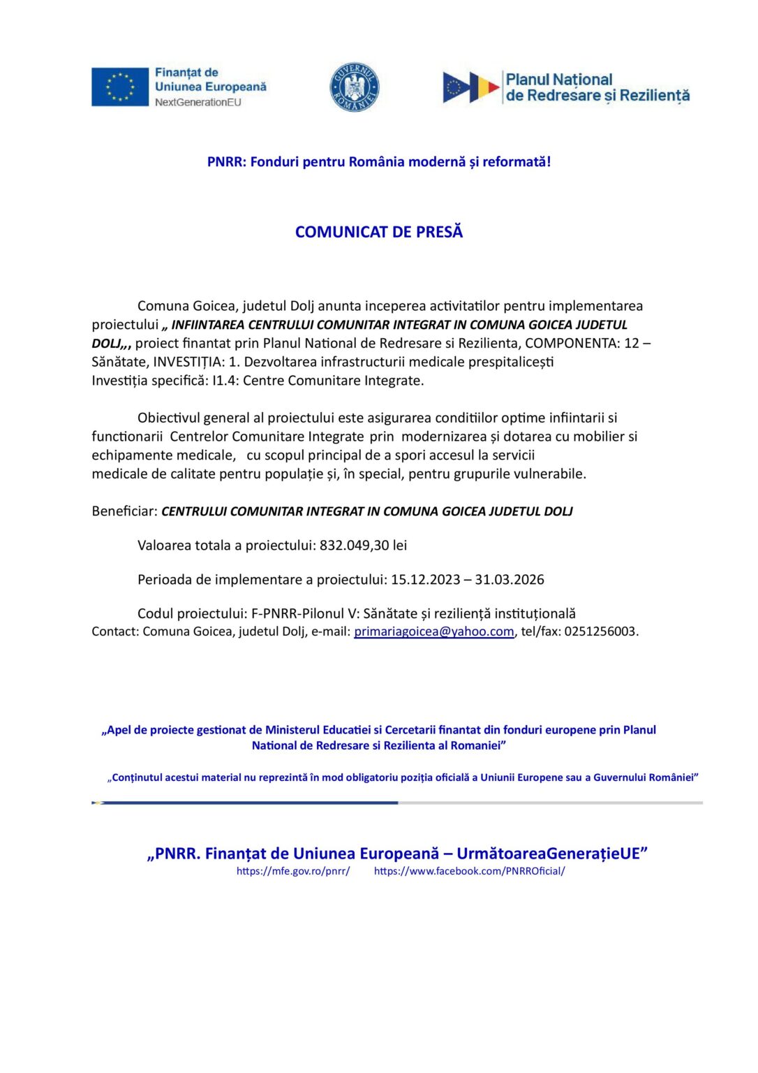 Contact: Comuna Goicea, judetul Dolj, e-mail: [email protected], tel/fax: 0251256003.