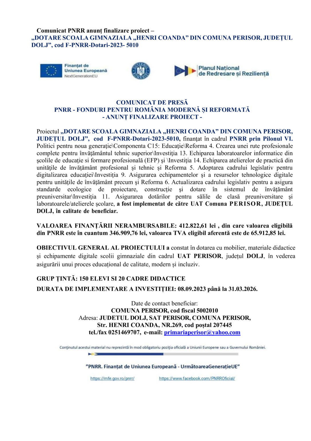 Proiectul „DOTARE SCOALA GIMNAZIALA „HENRI COANDA” DIN COMUNA PERISOR, JUDEȚUL DOLJ”, cod F-PNRR-Dotari-2023-5010, finanţat în cadrul PNRR prin Pilonul VI. Politici pentru noua generaţie\Componenta C15: Educaţie\Reforma 4. Crearea unei rute profesionale complete pentru învăţământul tehnic superior\Investiţia 13. Echiparea laboratoarelor informatice din şcolile de educaţie si formare profesională (EFP) şi \Investiţia 14. Echiparea atelierelor de practică din unităţile de învăţământ profesional şi tehnic şi Reforma 5. Adoptarea cadrului legislativ pentru digitalizarea educaţiei\Investiţia 9. Asigurarea echipamentelor şi a resurselor tehnologice digitale pentru unităţile de învăţământ precum şi Reforma 6. Actualizarea cadrului legislativ pentru a asigura standarde ecologice de proiectare, construcţie şi dotare în sistemul de învăţământ preuniversitar\Investiţia 11. Asigurarea dotărilor pentru sălile de clasă preuniversitare şi laboratoarele/atelierele şcolare, a fost implementat de către UAT Comuna PERISOR, JUDEȚUL DOLJ, în calitate de beneficiar.