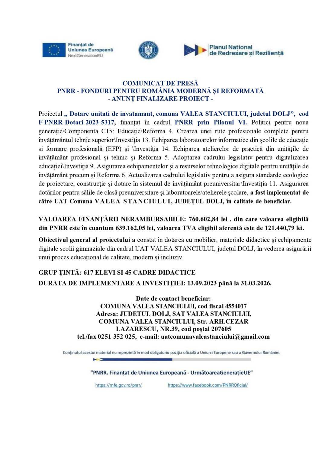 Proiectul ,, Dotare unitati de invatamant, comuna VALEA STANCIULUI, judetul DOLJ”, cod F-PNRR-Dotari-2023-5317, finanţat în cadrul PNRR prin Pilonul VI. Politici pentru noua generaţie\Componenta C15: Educaţie\Reforma 4. Crearea unei rute profesionale complete pentru învăţământul tehnic superior\Investiţia 13. Echiparea laboratoarelor informatice din şcolile de educaţie si formare profesională (EFP) şi \Investiţia 14. Echiparea atelierelor de practică din unităţile de învăţământ profesional şi tehnic şi Reforma 5. Adoptarea cadrului legislativ pentru digitalizarea educaţiei\Investiţia 9. Asigurarea echipamentelor şi a resurselor tehnologice digitale pentru unităţile de învăţământ precum şi Reforma 6. Actualizarea cadrului legislativ pentru a asigura standarde ecologice de proiectare, construcţie şi dotare în sistemul de învăţământ preuniversitar\Investiţia 11. Asigurarea dotărilor pentru sălile de clasă preuniversitare şi laboratoarele/atelierele şcolare, a fost implementat de către UAT Comuna VALEA STANCIULUI, JUDEȚUL DOLJ, în calitate de beneficiar.