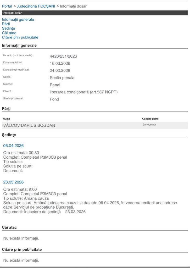 • Darius Vâlcov: Judecătoria Focşani se va pronunţa asupra liberării condiţionate în data de 6 aprilie 2026.