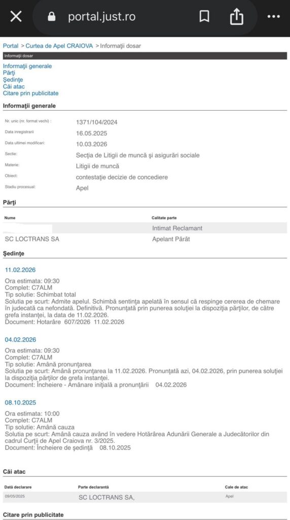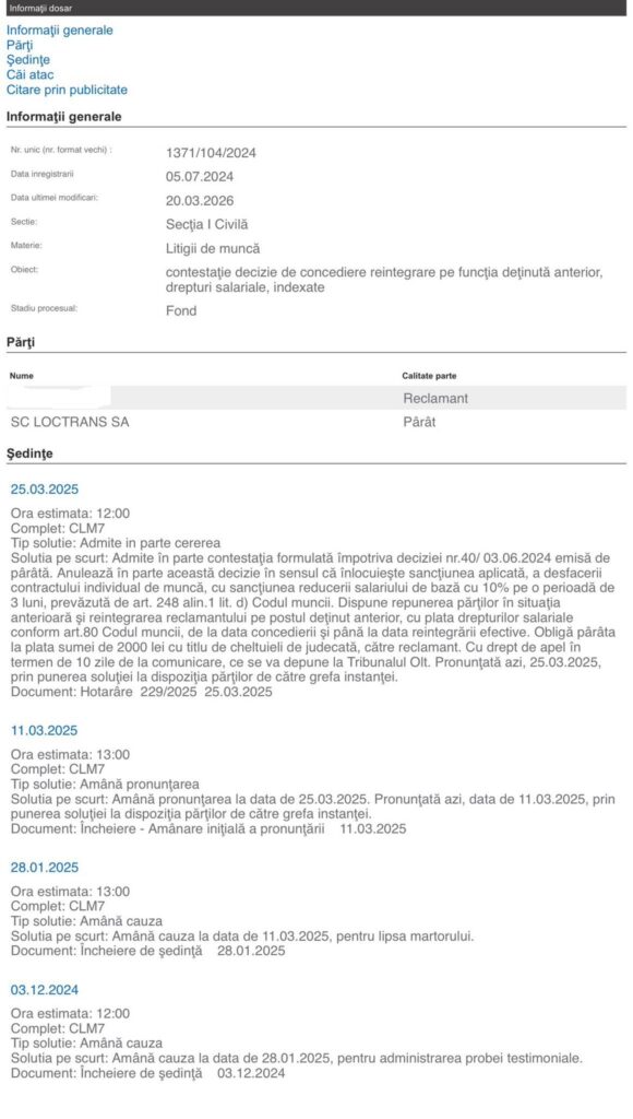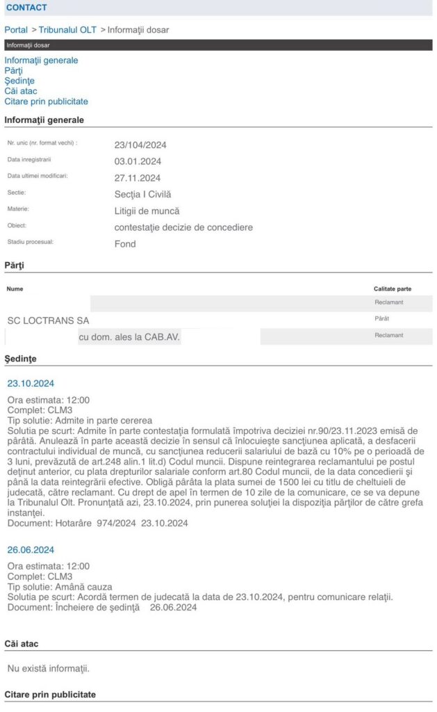Ambii angajați au atacat deciziile de concediere în instanță, însă finalitatea proceselor a fost diferită. În cazul primului șofer, acesta a câștigat la Tribunalul Olt, iar Loctrans a decis să nu mai facă recurs. Rezultatul a fost reîncadrarea pe funcție și plata tuturor drepturilor salariale restante.
