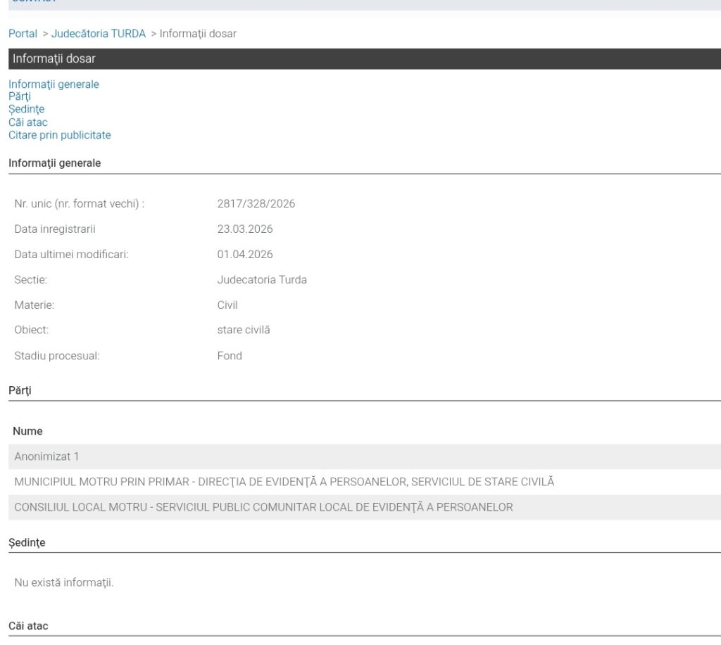 Procesul cu numărul 2817/328/2026, aflat pe rolul Judecătoriei Turda, urmează să stabilească un prim termen de judecată. Decizia finală va obliga instituțiile din subordinea Consiliului Local Motru să actualizeze bazele de date conform realității de gen recunoscute juridic pentru solicitantul cu domiciliul în Cluj.