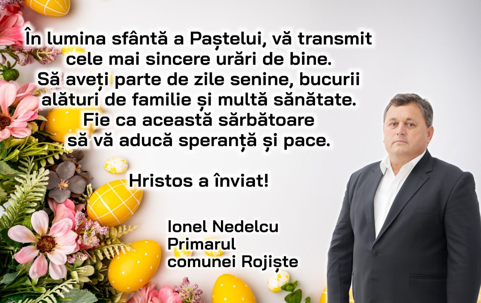 DoljOlteniaUrarea de Paște a primarului comunei Rojiște Jurnalul Olteniei 9 aprilie 2026 Share Urarea de Paște a primarului comunei Rojiste SHARE Jurnalul Olteniei See Full Bio Distribuie acest articol Facebook Whatsapp Whatsapp Email Copy Link Print Articolul precedent Gorj: A murit soția fostului șef AEP, Toni Greblă Articolul următor Urarea de Paște a primarului comunei Almăj ULTIMA ORA Slatina: Prefectul demască minciuna primarului Farmaciile din Olt deschise de Paște: Programul complet Buget Craiova 2026: Proiectele anunțate de Olguța Vasilescu Urarea de Paște a primarului comunei Podari Fost primar din Dolj și afaceriști din Olt, la judecată Mehedinţi: Foști șefi de instituții, trimiși în judecată de DNA pentru un tun de milioane de lei Urarea de Paște a primarului comunei Cârcea Poliția Locală Slatina: Concedieri pentru poliţişti și salarii mărite pentru şefi Urarea de Paște a primarului comunei Almăj Urarea de Paște a primarului comunei Rojiște