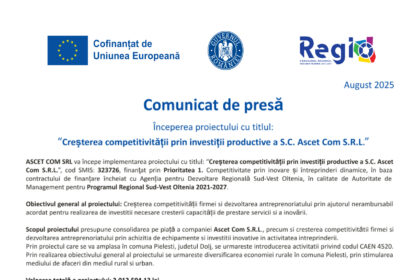 Începerea proiectului cu titlul: “Creșterea competitivității prin investiții productive a S.C. Ascet Com S.R.L.”