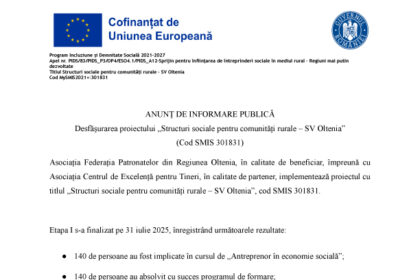 ANUNȚ DE INFORMARE PUBLICĂ – Desfășurarea proiectului „Structuri sociale pentru comunități rurale – SV Oltenia”(Cod SMIS 301831)
