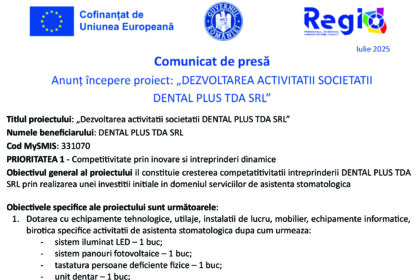 Anunț începere proiect: „DEZVOLTAREA ACTIVITATII SOCIETATII DENTAL PLUS TDA SRL”