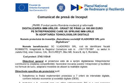Comunicat de presă de început – „PNRR: Fonduri pentru România modernă și reformată” DIGITALIZAREA IMM-URILOR – GRANT DE PÂNĂ LA 100.000 EURO PE ÎNTREPRINDERE CARE SĂ SPRIJINE IMM-URILE ÎN ADOPTAREA TEHNOLOGIILOR DIGITALE