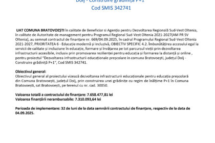Comunicat de presă – „Dezvoltarea infrastructurii educaționale preșcolare in comuna Bratovoești, județul Dolj – Construire gradiniță P+1“