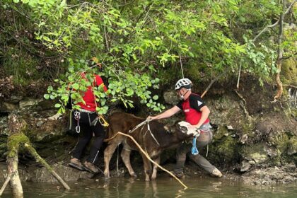 Udă, speriată, blocată! Vițea salvată de pompieri și salvamontiști
