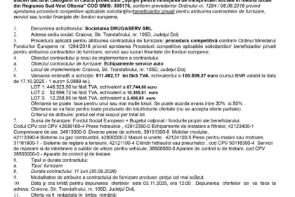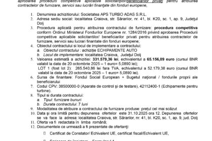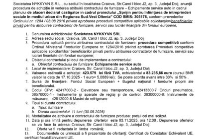 ANUNT PRVIND ORGANIZAREA ACHIZITIEI DE BUNURI – ECHIPAMENTE SERVICE AUTO