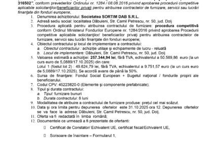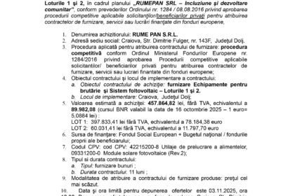 ANUNŢ PRVIND ORGANIZAREA ACHIZIŢIEI DE ECHIPAMENTE PENTRU BRUTÃRIE ŞI SISTEM FOLTOVOLTAIC – LOTURILE 1 ŞI 2