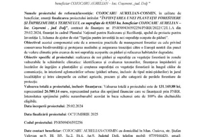 Comunicat de presă – „PNRR: Fonduri pentru România modernă și reformată!” Finalizare proiect: „ÎNFIINȚAREA UNEI PLANTAȚII FORESTIERE ȘI ÎMPREJMUIREA TERENULUI, cu suprafața de 0,9285 ha, beneficiar COJOCARU AURELIAN – loc. Coșoveni , jud. Dolj”