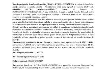 Comunicat de presă – „PNRR: Fonduri pentru România modernă și reformată!” Lansare proiect: „Împădurirea unui teren agricol în comuna Bratovoești, beneficiar NICOLA IONELA-MĂDĂLINA”