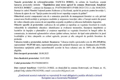 Comunicat de presă – „PNRR: Fonduri pentru România modernă și reformată!” Lansare proiect: „Împădurirea unui teren agricol în comuna Bratovoești, beneficiar OANCEA DOREL”