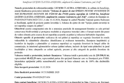 Comunicat de presă – „PNRR: Fonduri pentru România modernă și reformată!” Finalizare proiect: „Schema de ajutor de stat SPRIJIN PENTRU INVESTIȚII ÎN NOI SUPRAFEȚE OCUPATE DE PĂDURI din PNRR pentru suprafața de 3,0340 ha, beneficiar LICȘOR CLAUDIA-ANIȘOARA, amplasat în comuna Castranova, jud. Dolj”
