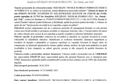 Comunicat de presă – Finalizare proiect: „Schema de ajutor de stat SPRIJIN PENTRU INVESTIȚII ÎN NOI SUPRAFEȚE OCUPATE DE PĂDURI din PNRR, pentru suprafața de 15,7923 ha, beneficiar MĂCEȘANU NICOLAE-FLORIAN PFA – loc. Daneți , jud. Dolj”