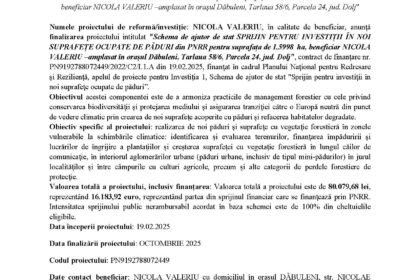 Comunicat de presă – Finalizare proiect: „Schema de ajutor de stat SPRIJIN PENTRU INVESTIȚII ÎN NOI SUPRAFEȚE OCUPATE DE PĂDURI din PNRR pentru suprafața de 1,5998 ha, beneficiar NICOLA VALERIU –amplasat în orașul Dăbuleni, Tarlaua 58/6, Parcela 24, jud. Dolj”