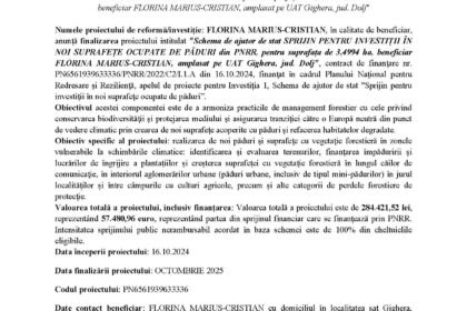 Comunicat de presă – „PNRR: Fonduri pentru România modernă și reformată!” Finalizare proiect: „Schema de ajutor de stat SPRIJIN PENTRU INVESTIȚII ÎN NOI SUPRAFEȚE OCUPATE DE PĂDURI din PNRR, pentru suprafața de 3,4994 ha, beneficiar FLORINA MARIUS-CRISTIAN, amplasat pe UAT Gighera, jud. Dolj”